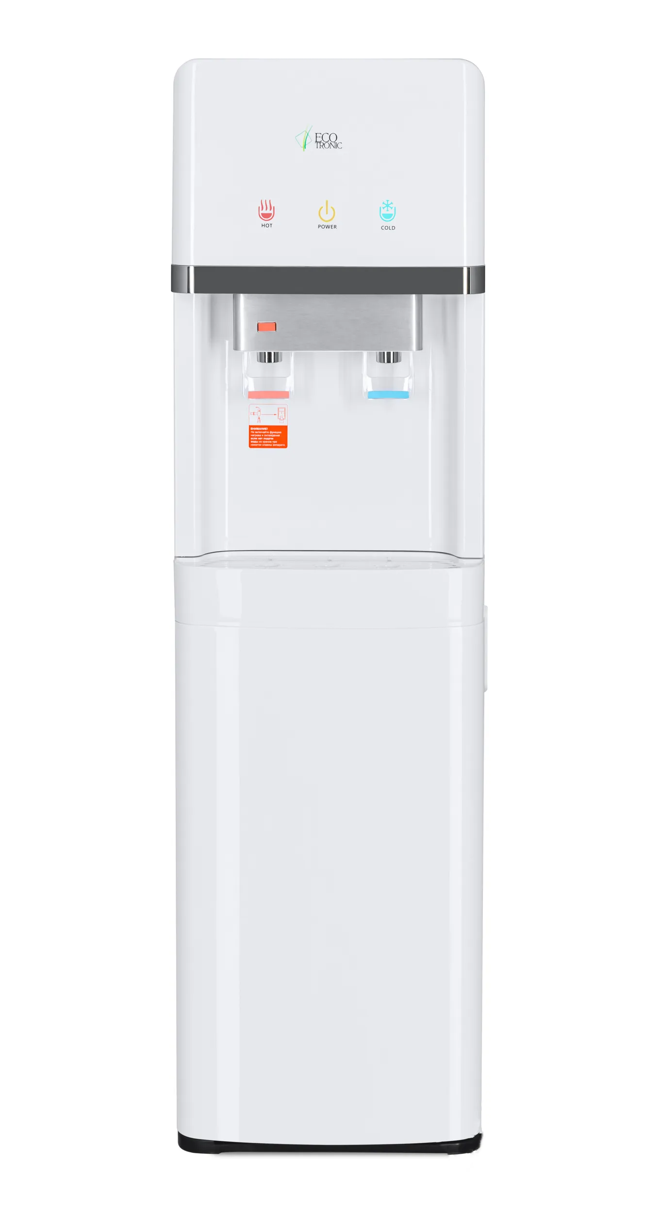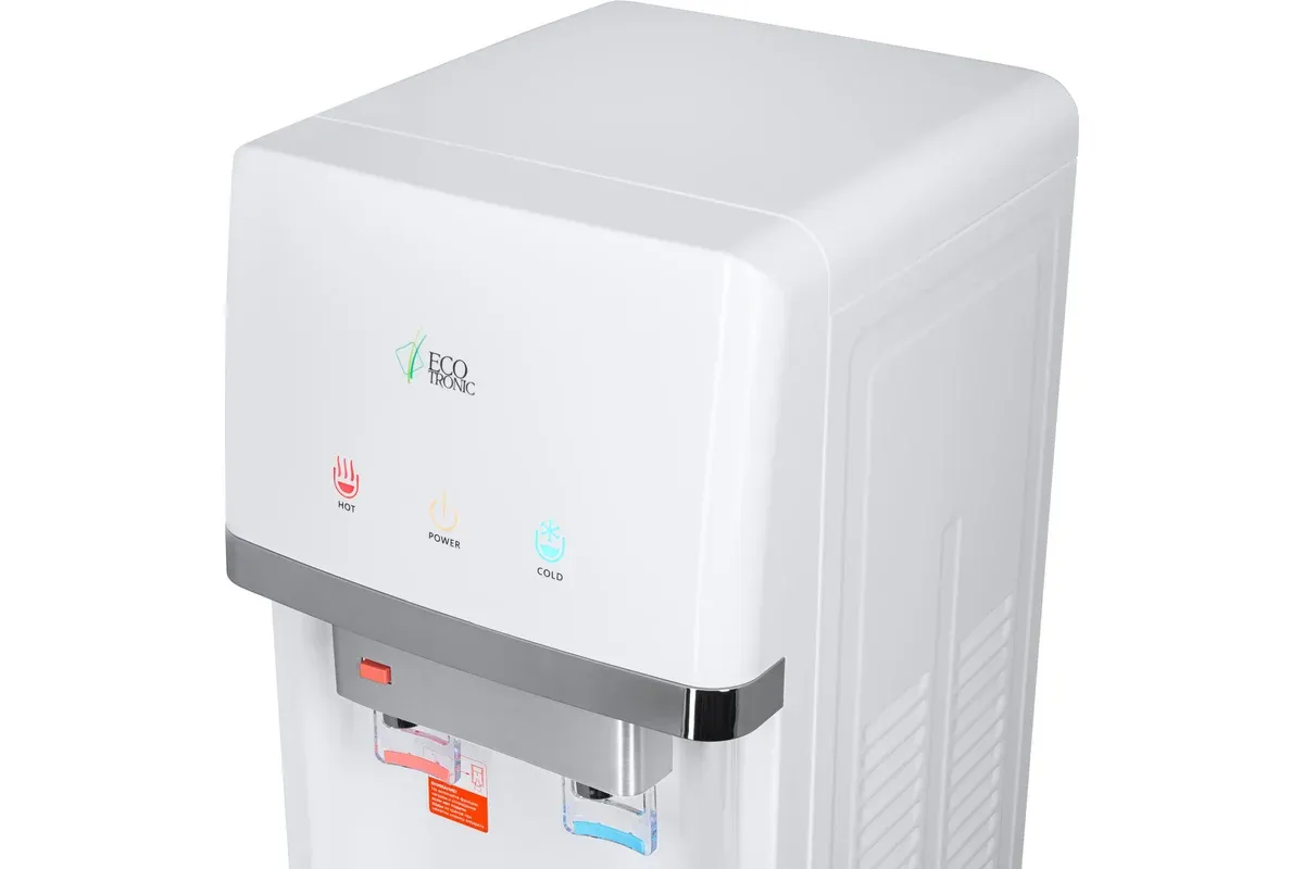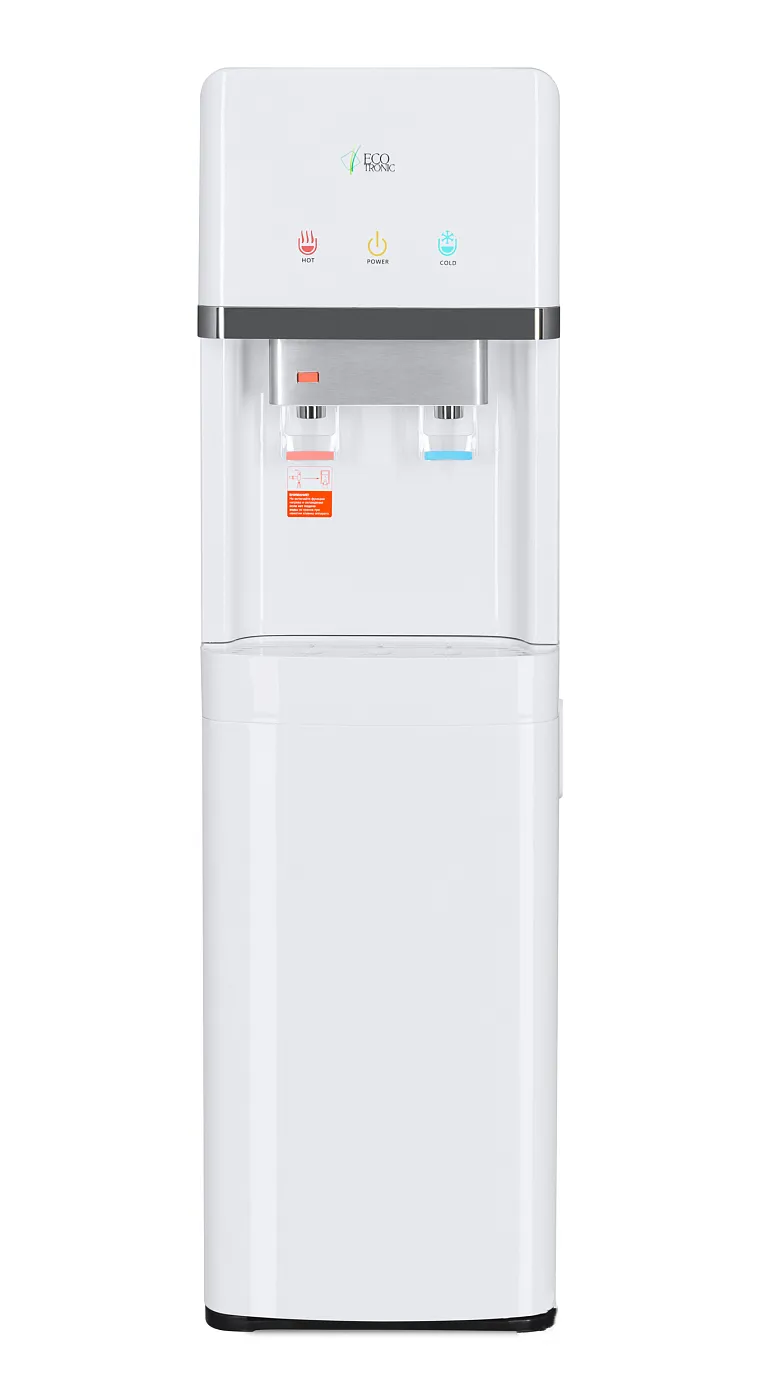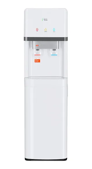 Напольный кулер с нижней загрузкой бутыли и электронным охлаждением. Корпус белого цвета с серебристым декором. Лоток водоприема с поплавком перелива. Индикация режимов нагрева и охлаждения воды и работы аппарата. Краны «нажим кружкой», защита от детей на кране горячей воды.