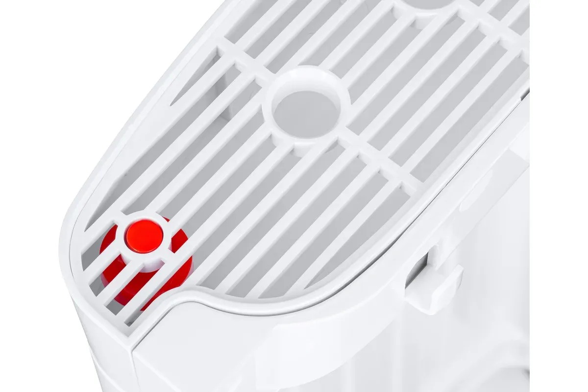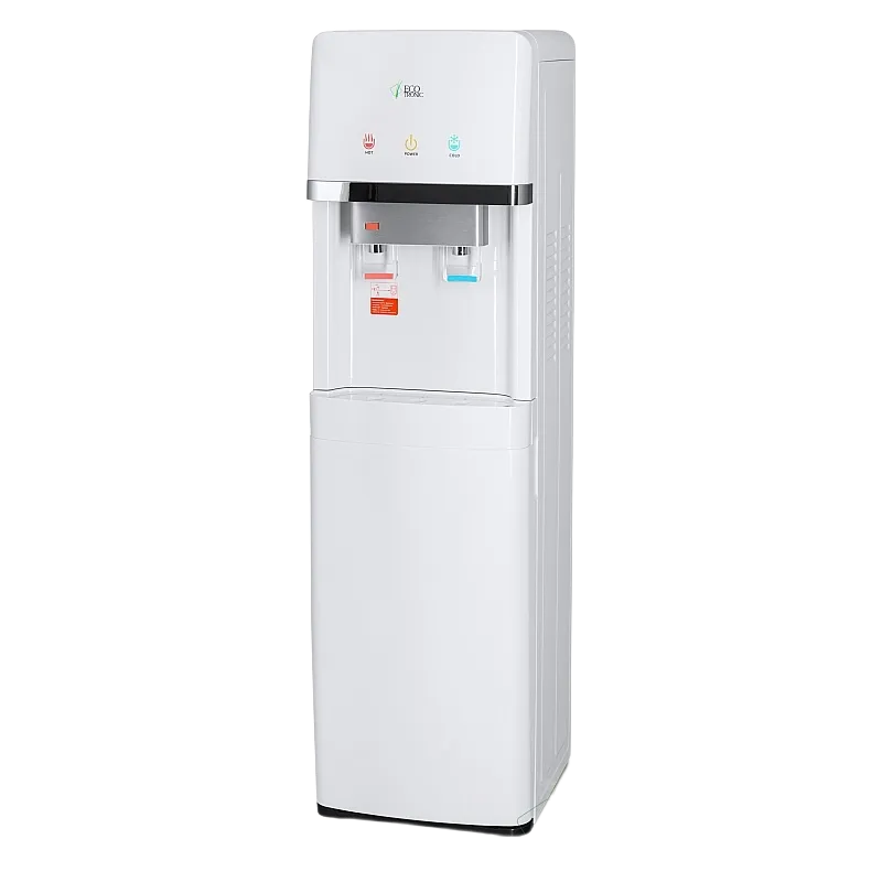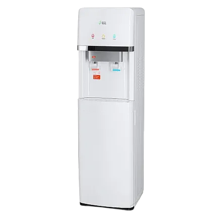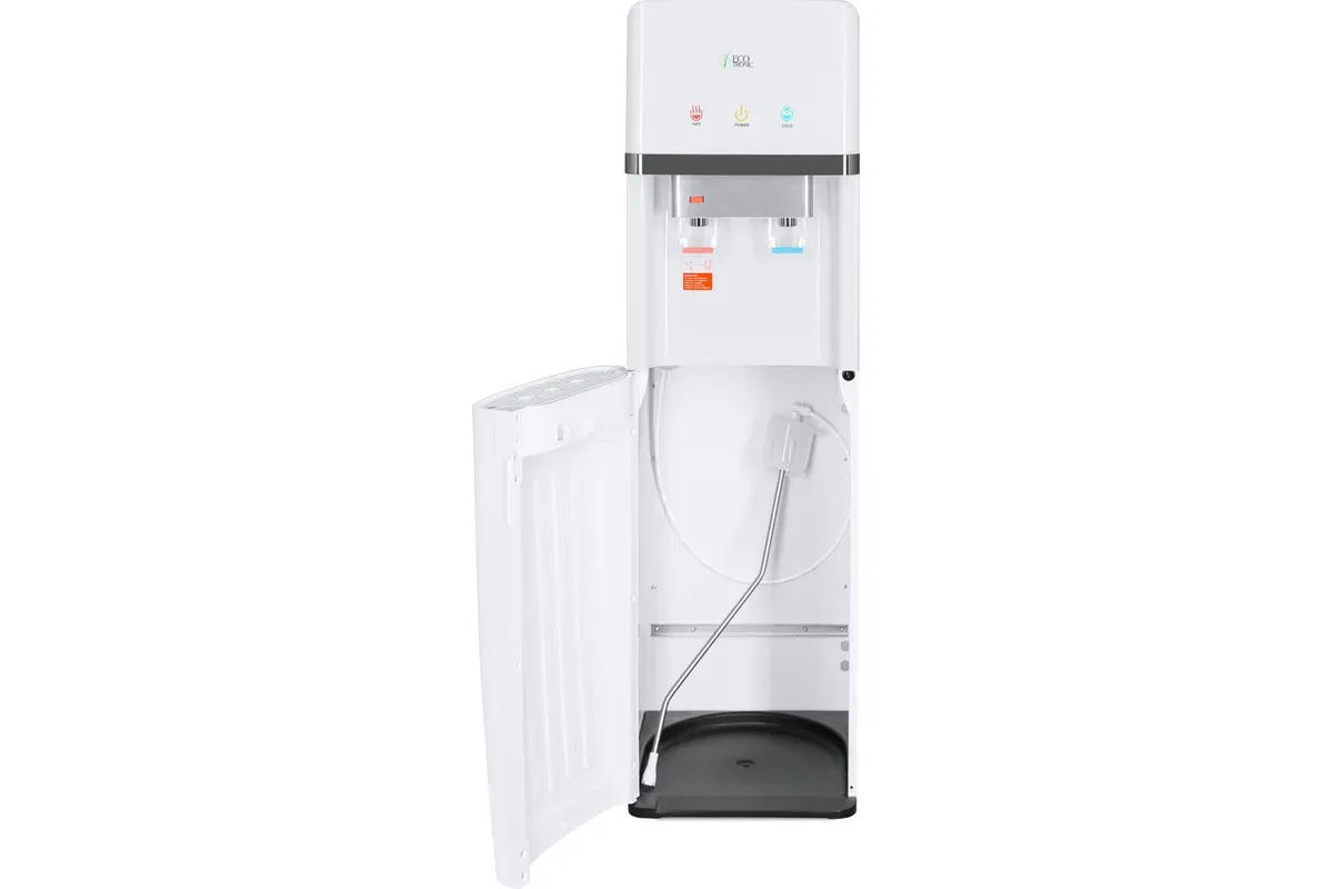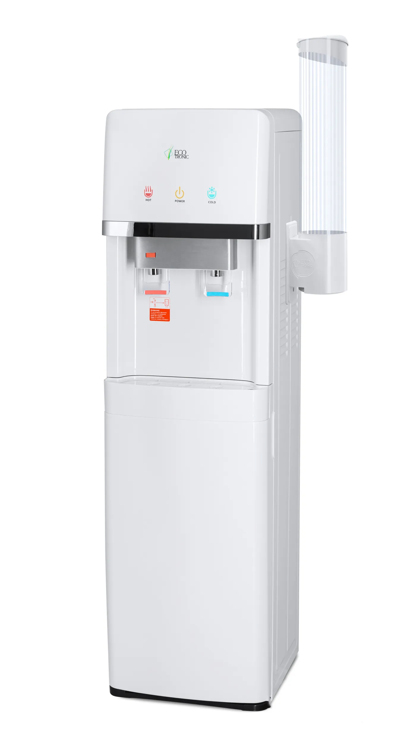 Напольный кулер с нижней загрузкой бутыли и электронным охлаждением. Корпус белого цвета с серебристым декором. Лоток водоприема с поплавком перелива. Индикация режимов нагрева и охлаждения воды и работы аппарата. Краны «нажим кружкой», защита от детей на кране горячей воды.