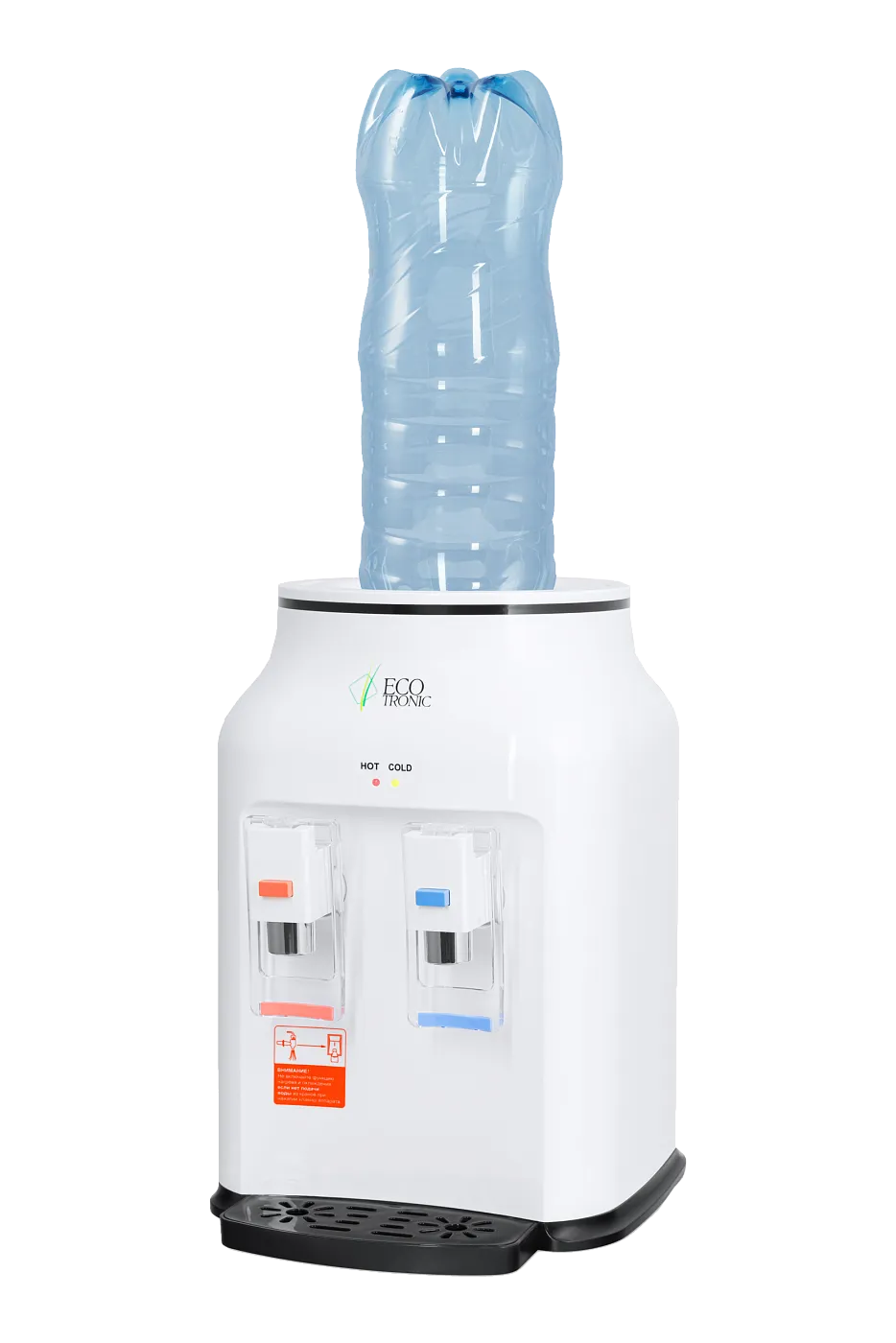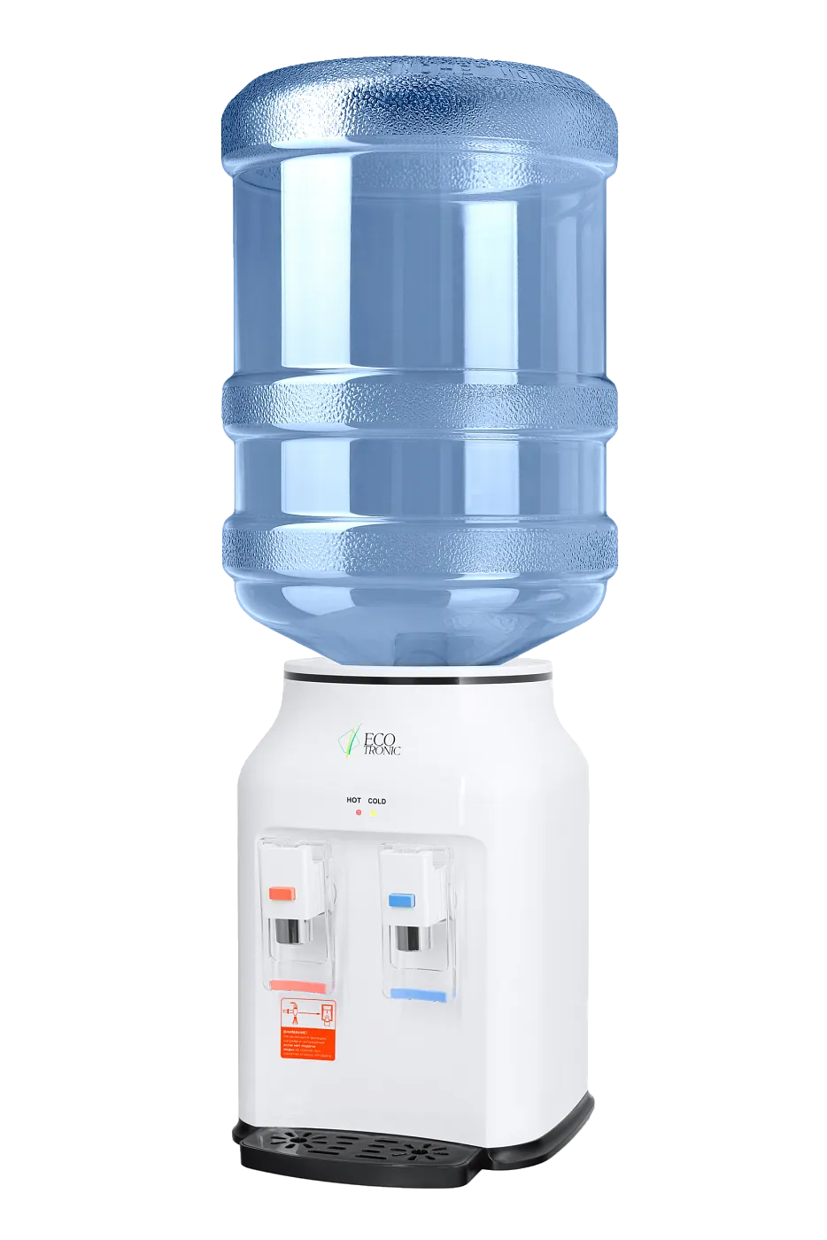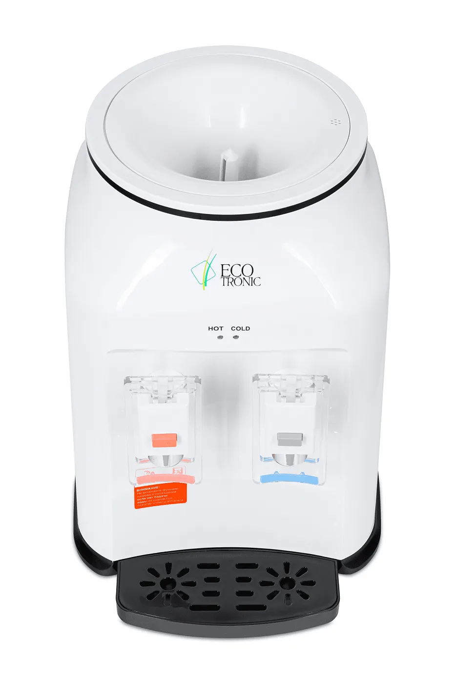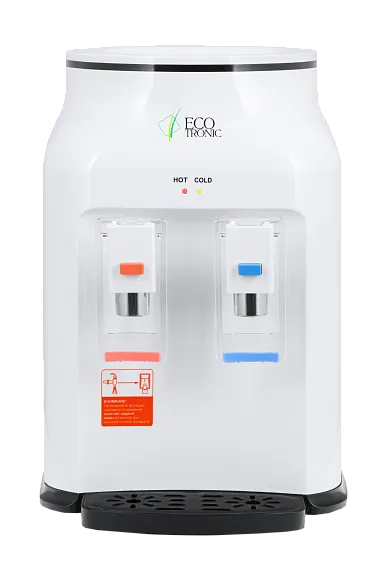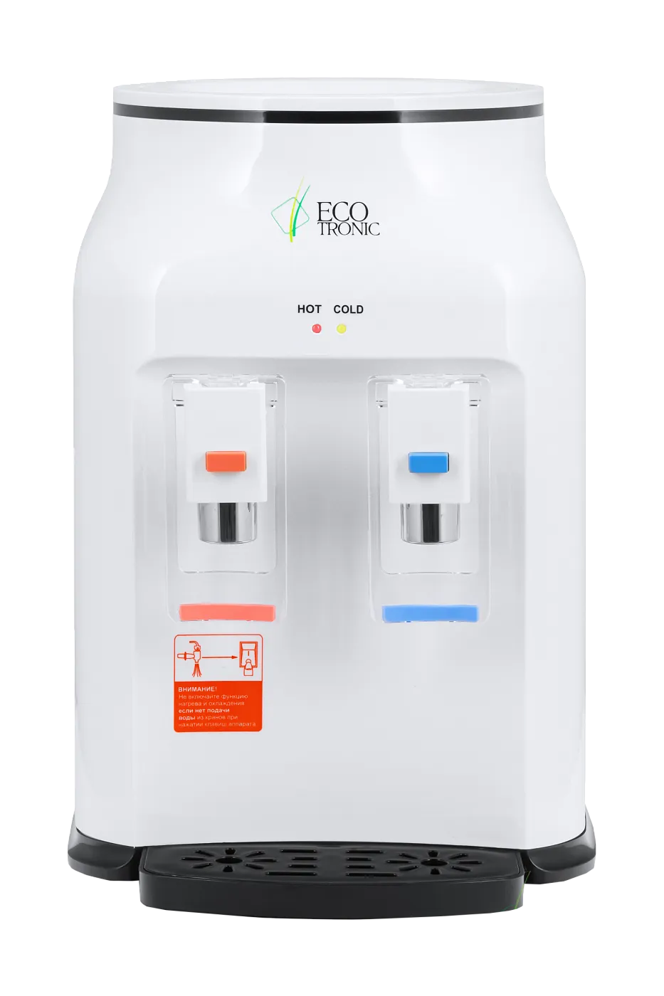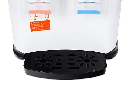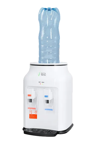 Настольный кулер с электронным охлаждением. Корпус белого цвета, краны типа "нажим кружкой". Ножки на присосках не дают кулеру опрокинуться или упасть на бок. Светодиодный индикатор нагрева и охлаждения.