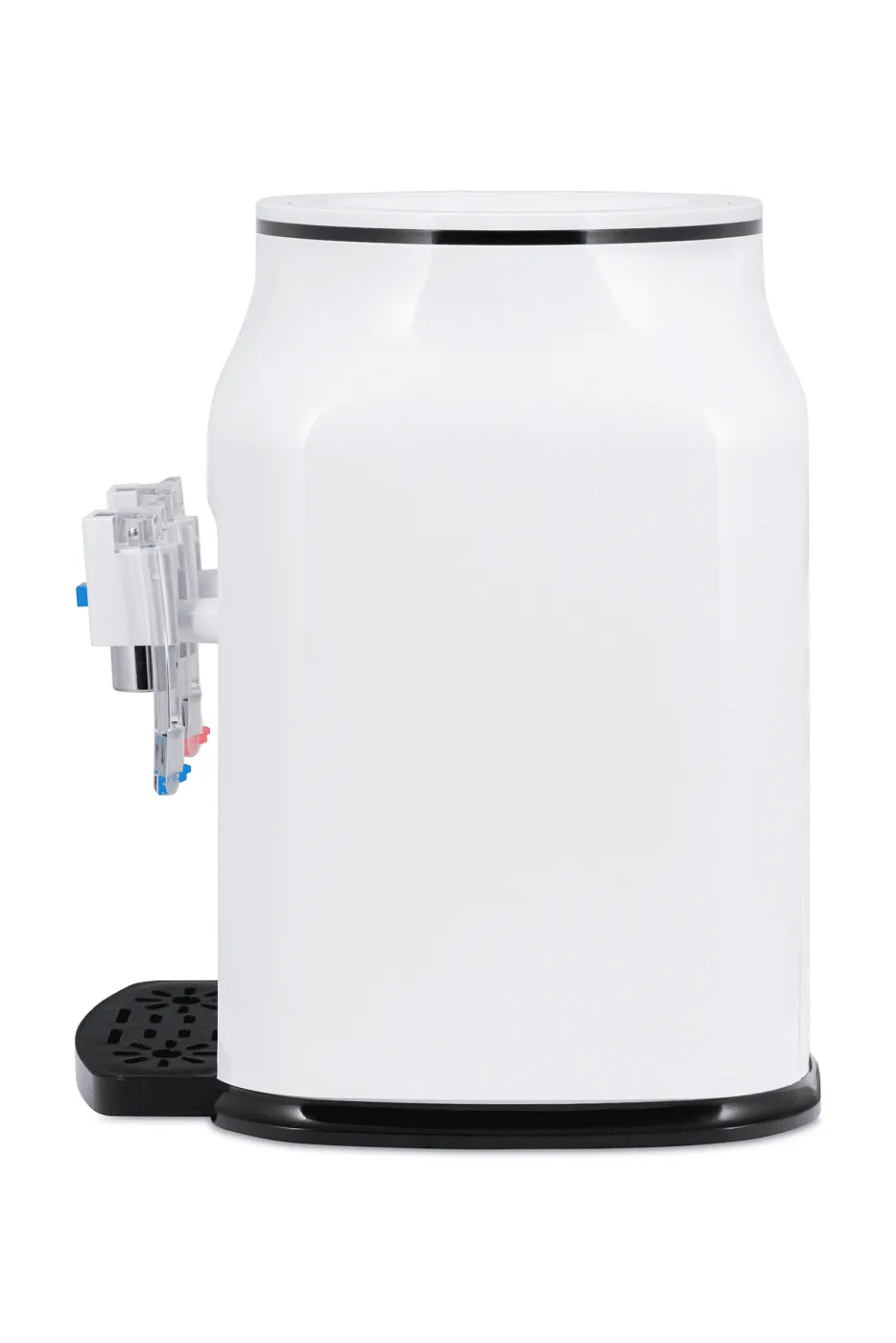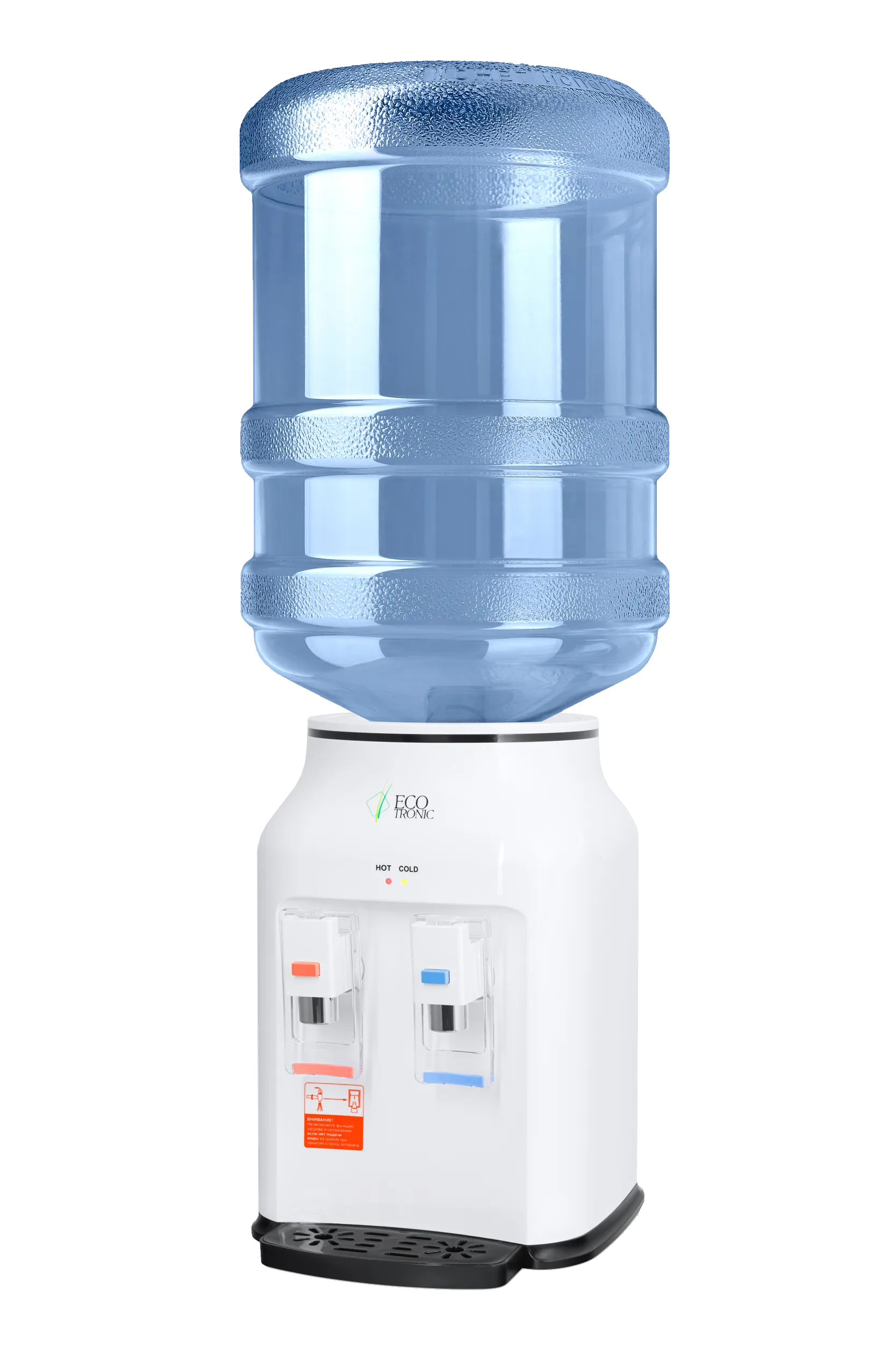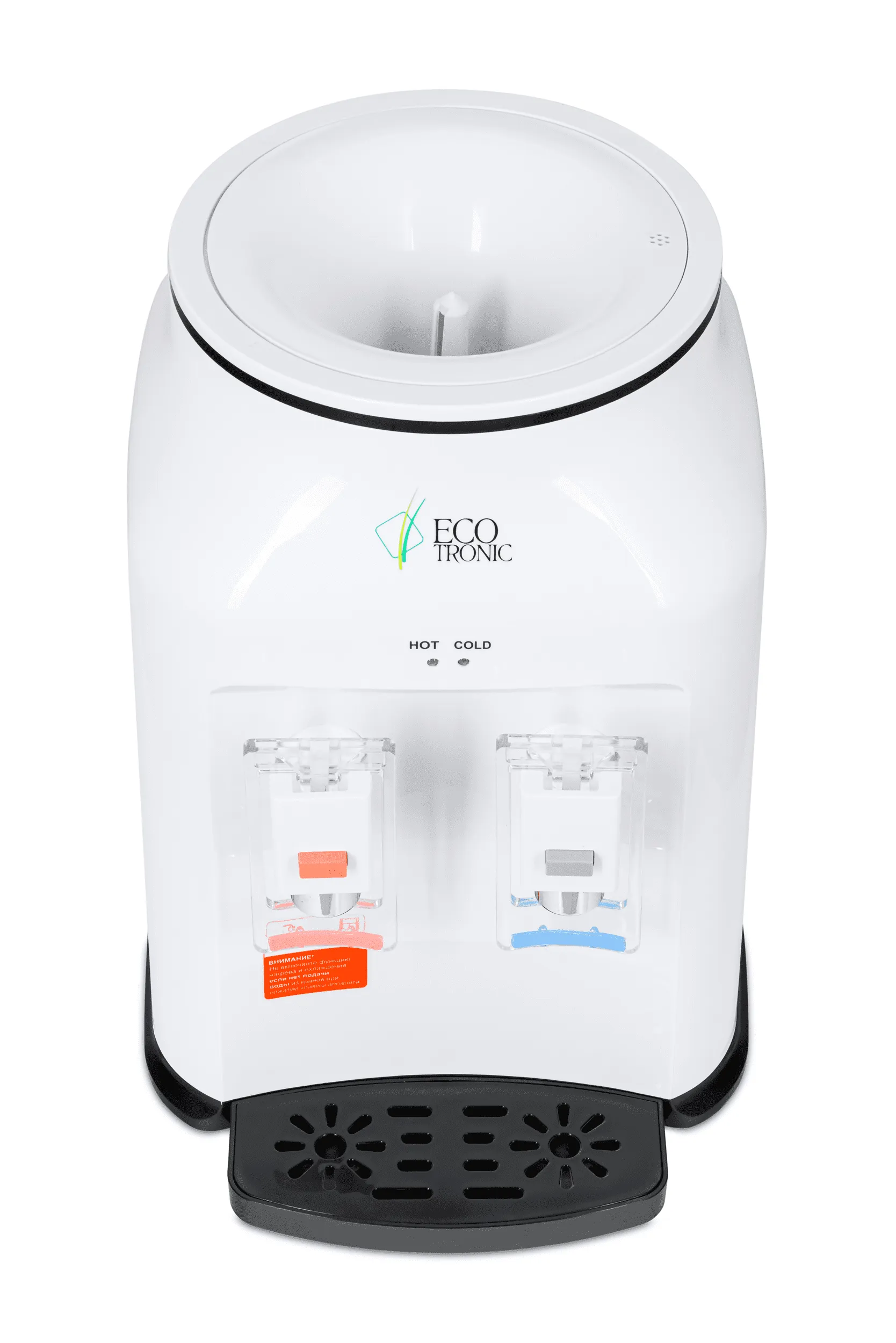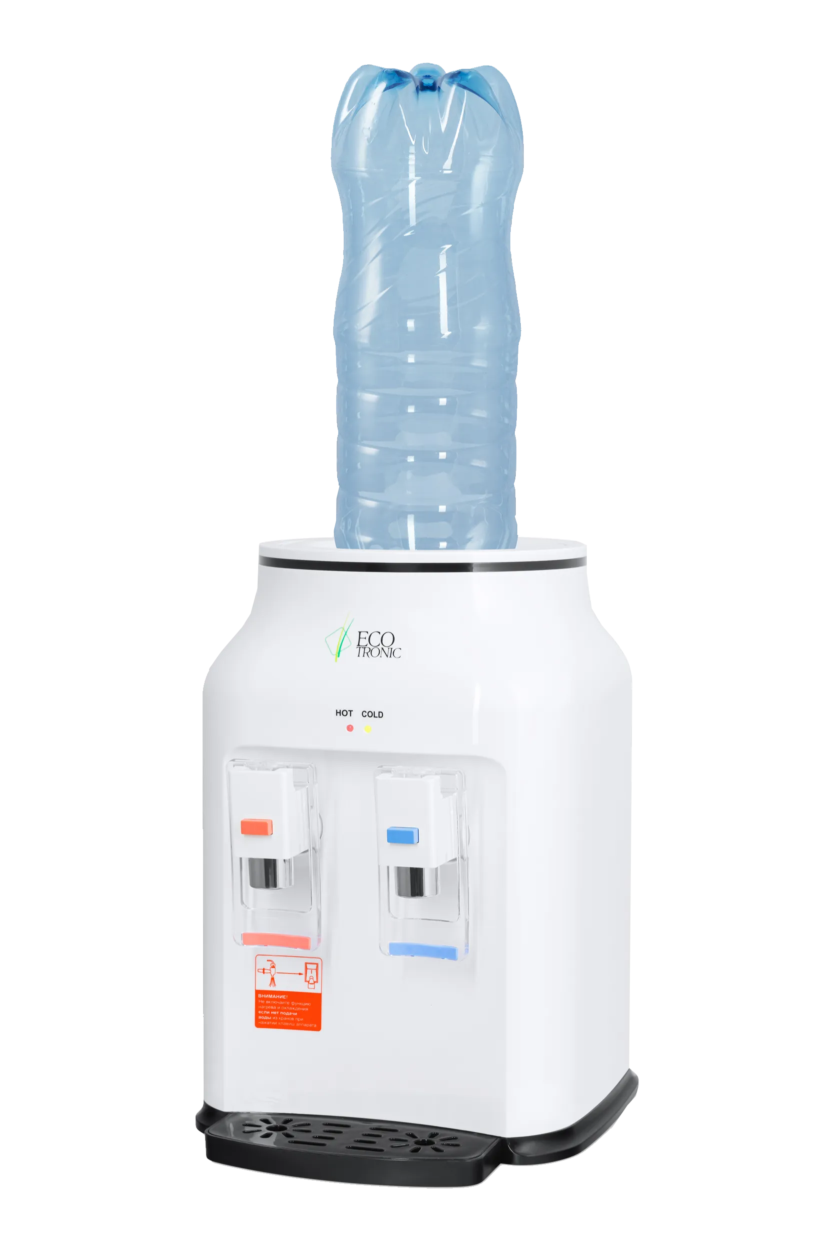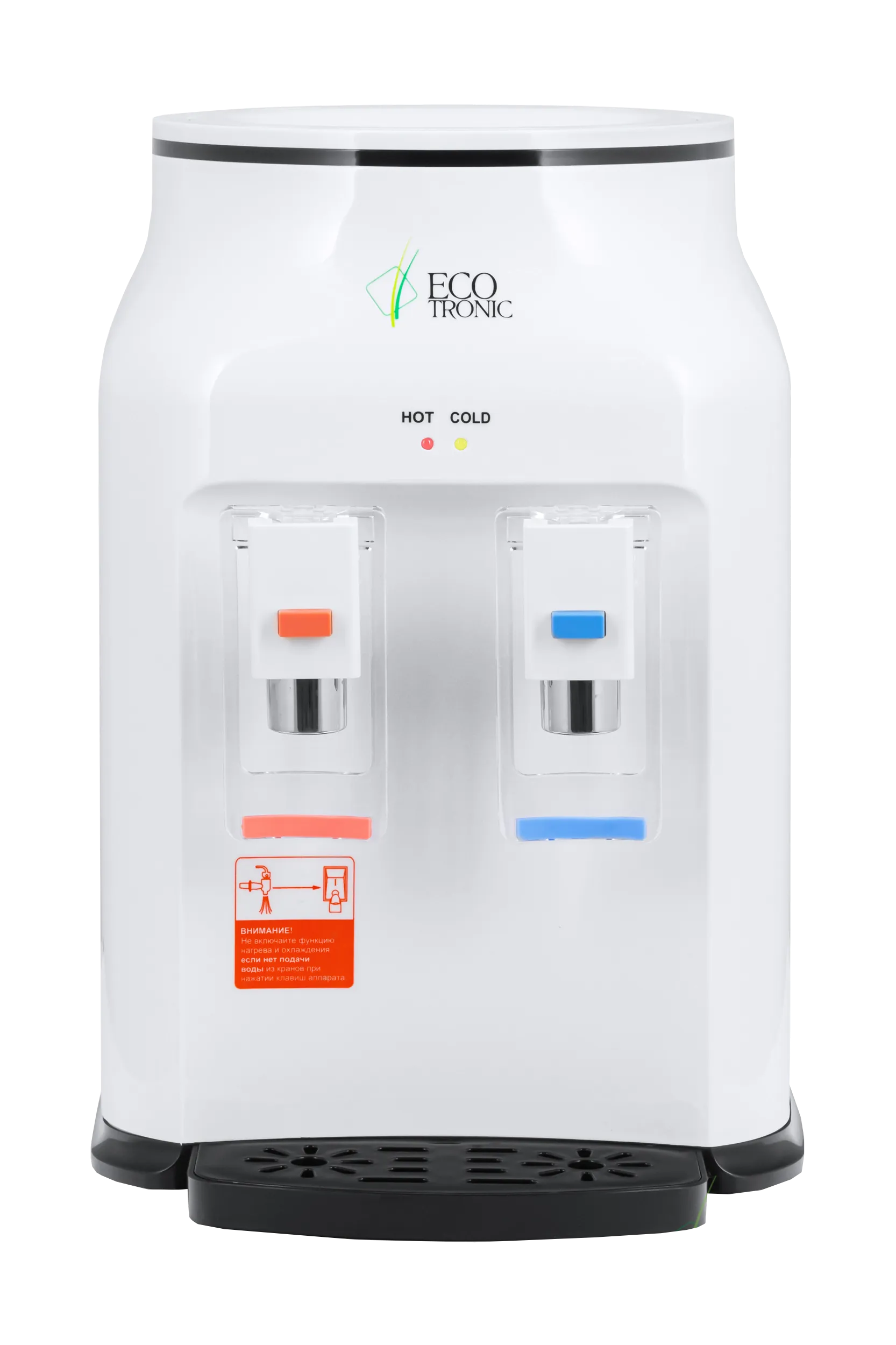Настольный кулер с электронным охлаждением. Корпус белого цвета, краны типа "нажим кружкой". Ножки на присосках не дают кулеру опрокинуться или упасть на бок. Светодиодный индикатор нагрева и охлаждения.