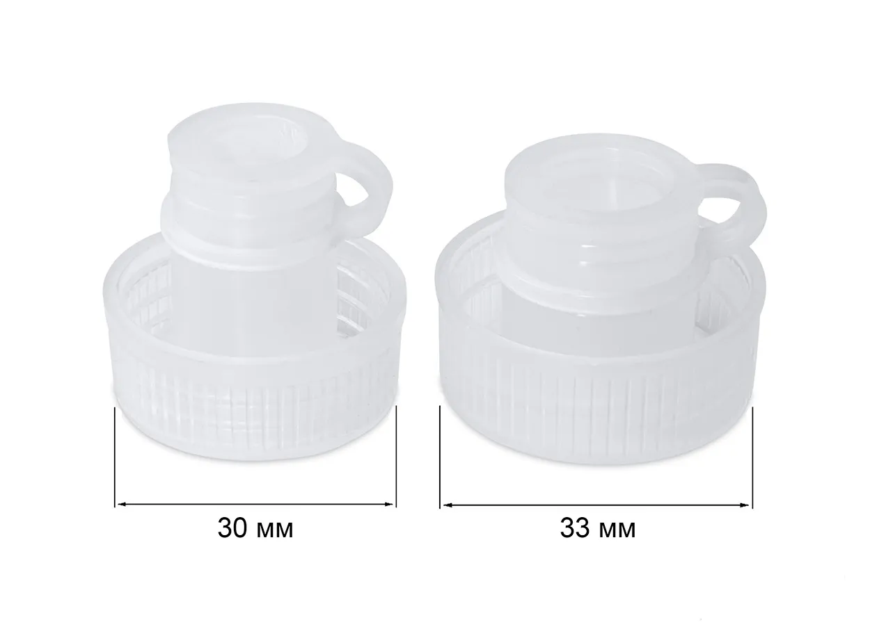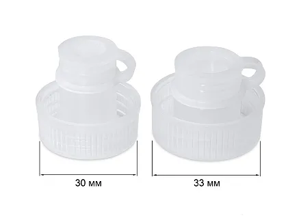 В комплекте две насадки диаметром 30 мм и 33 мм, позволяющие устанавливать бутылки разного типа с подходящим диаметром под насадки (5 л, 3 л, 2 л или 1,5 л).