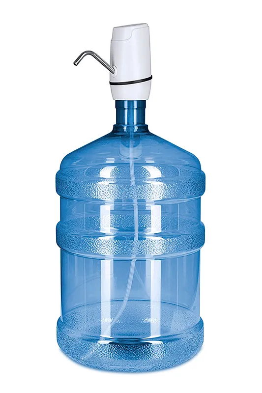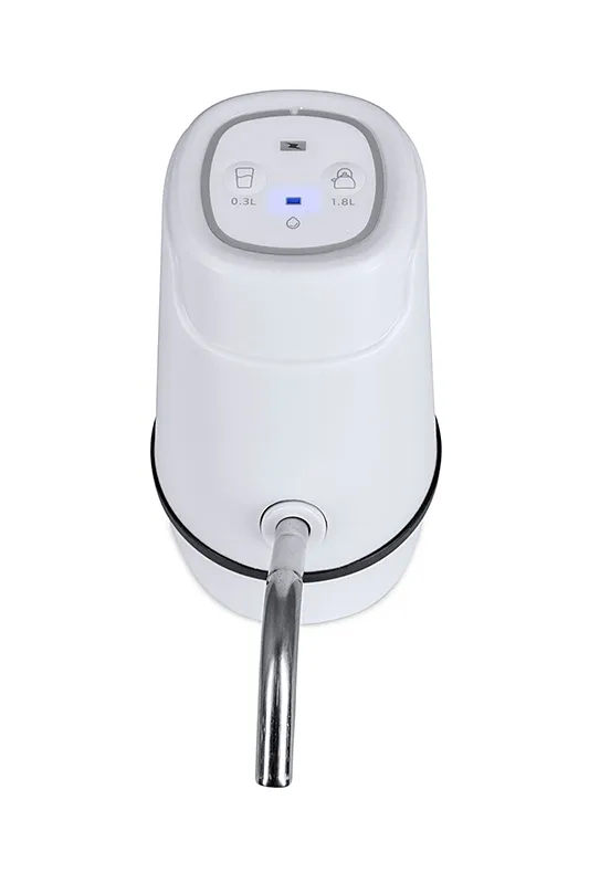 Конструкция включает гибкую заборную трубку, которая позволяет полностью опустошить бутыль, и индикатор заряда аккумулятора. Для подзарядки используется кабель mini‑USB, входящий в комплект, однако адаптер для сети придётся приобрести отдельно — подойдёт любой стандартный.