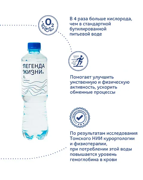 Кислородная вода «Легенда жизни» О2» разработана по современной технологии обогащения кислородом. Употребление такой воды помогает улучшить умственную и физическую активность, ускорить обменные процессы.