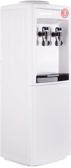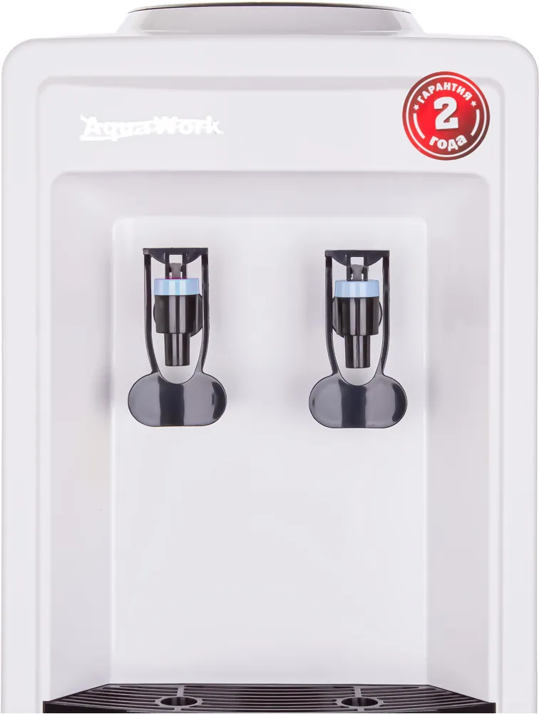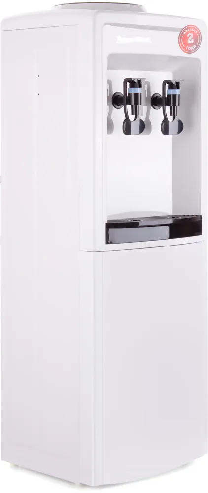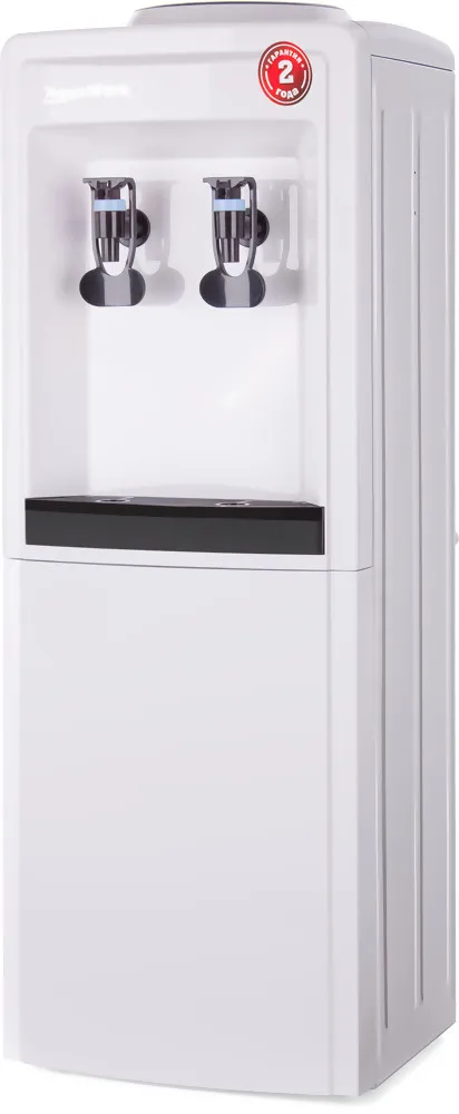 Бутыль объёмом 19 литров устанавливается сверху, как в классических кулерах. Вода подаётся через два краника типа «нажим кружкой» - левый и правый. Для получения воды достаточно просто поставить стакан, кружку или бутылку и слегка надавить. Механизм простой, надёжный и не требует электропитания - это полностью пассивная система розлива.
