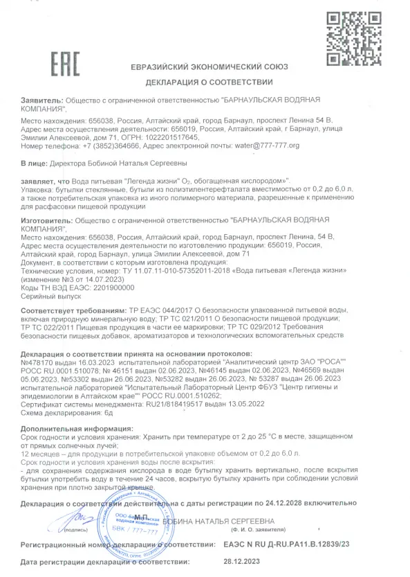 Декларация воды Легенда жизни с кислородом